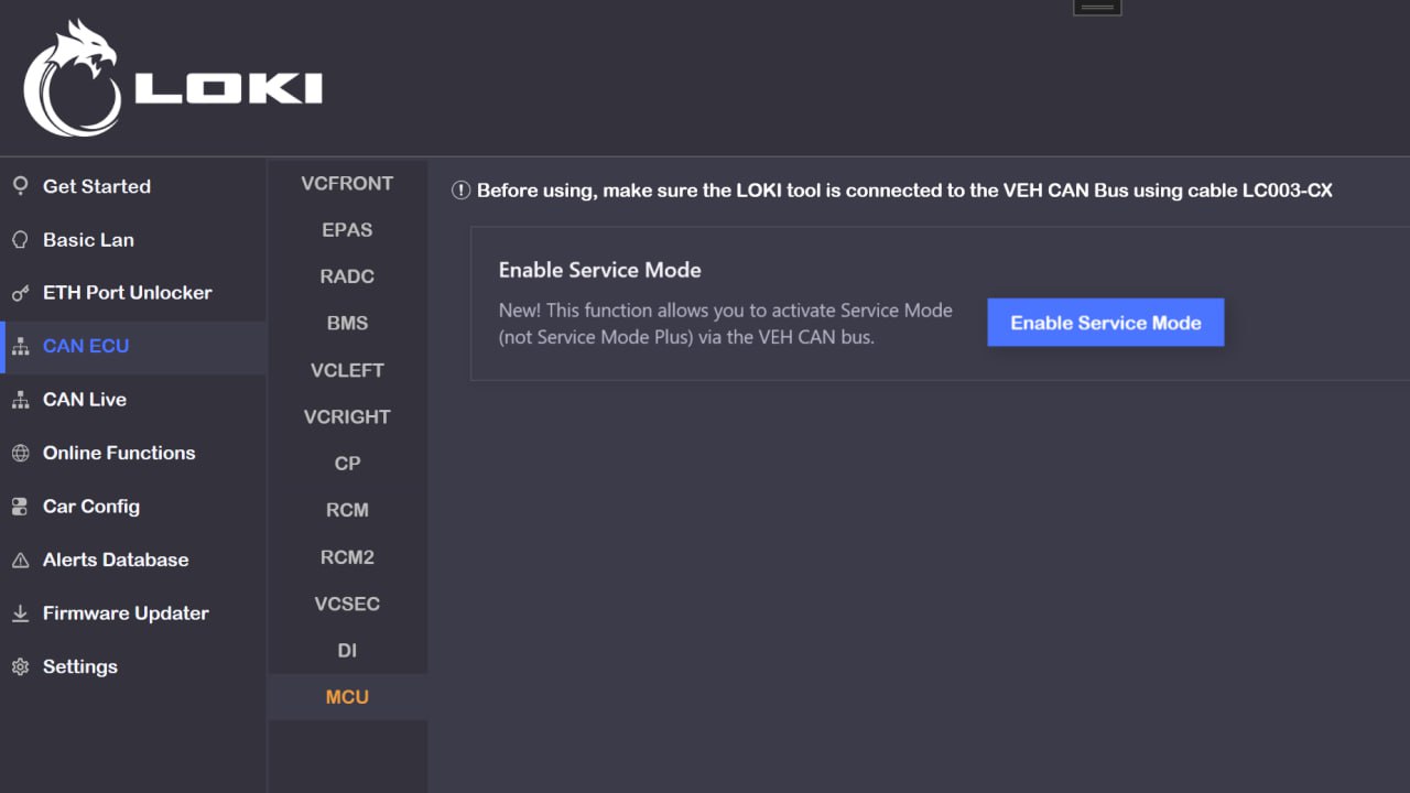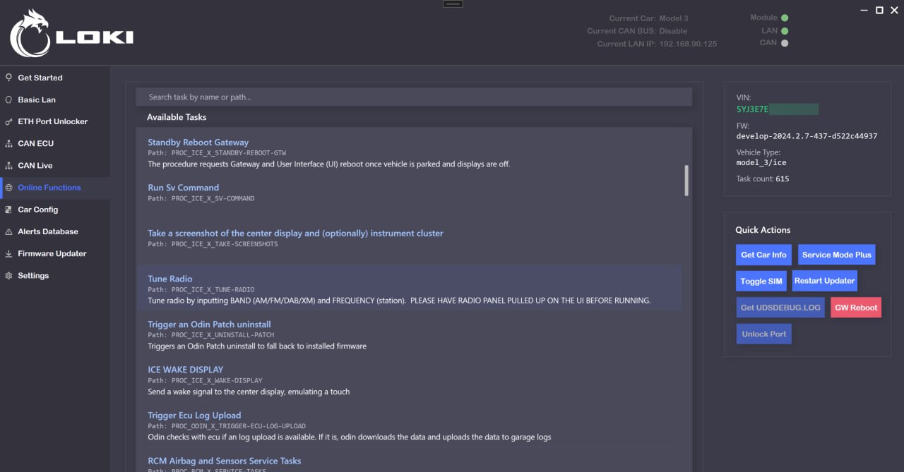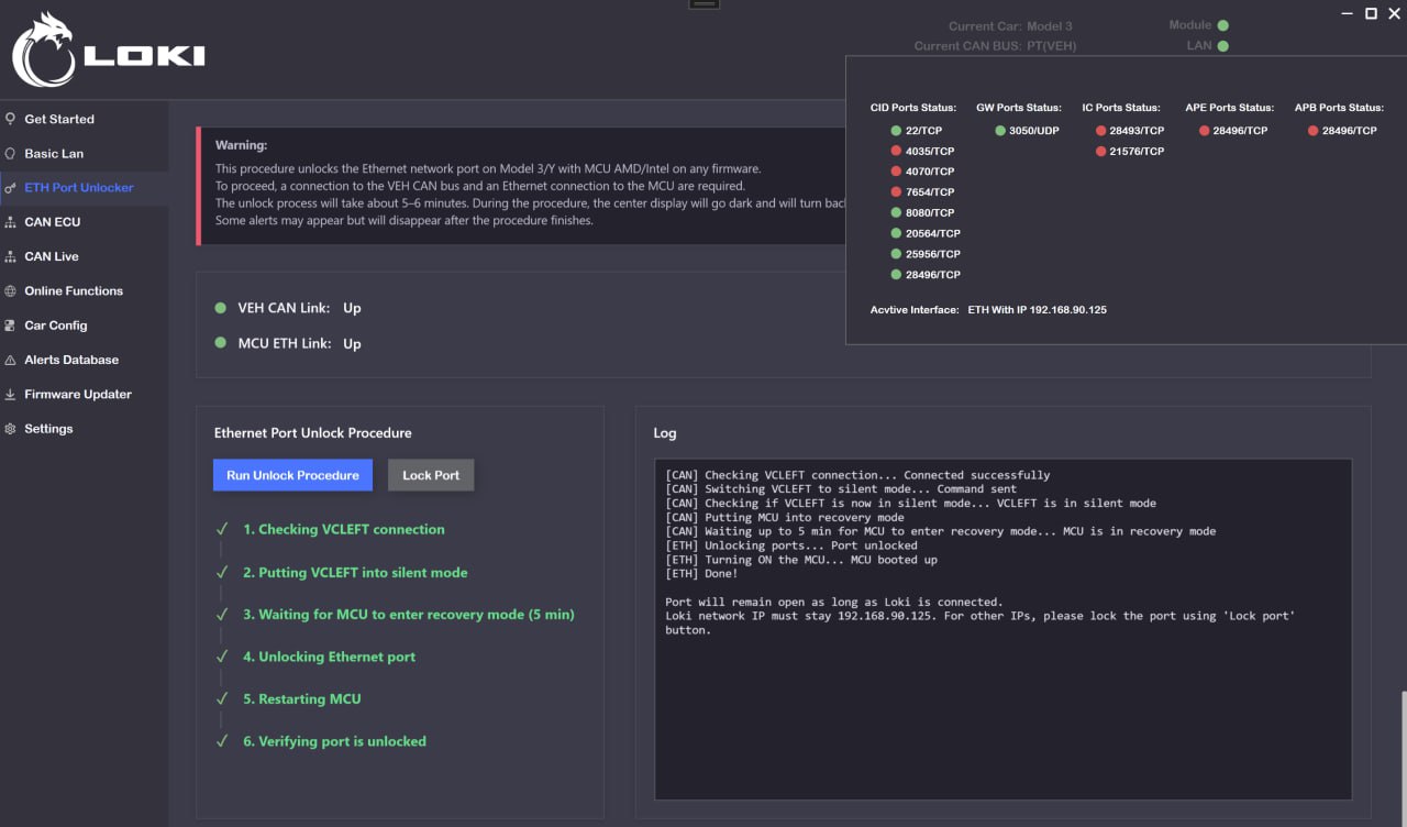 - Se ha añadido la función de desbloqueo del puerto de red para todos los Model 3/Y con cualquier firmware, a través del bus CAN. Esto permite abrir los puertos de todos los actualizadores (Telnet, HTTP, Gadget) y el puerto del gateway para cambiar la configuración con las pantallas activadas, sin necesidad de desmontar la MCU. Probado en M3 Intel HW3.0, MY AMD HW3.1, MY AMD HW4.0. En vehículos del mercado chino, esta opción permite realizar un redeploy desde LOKI sin restricciones.