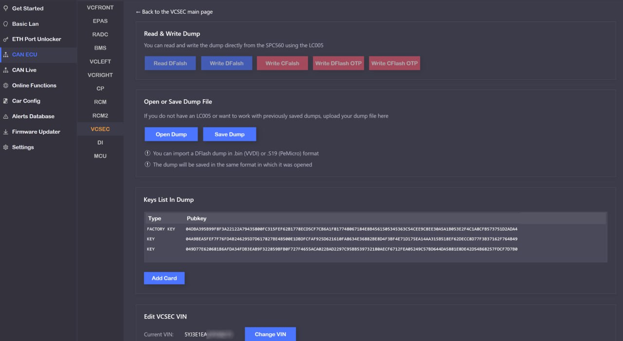 - Se ha añadido un nuevo método de vinculación de llaves para Model 3/Y sin necesidad de certificados. Para vincular las llaves se puede utilizar cables LC005, VVDI o PeMicro. La nueva funcionalidad permite modificar el número VIN en el volcado (dump) para facilitar la vinculación sin inconvenientes. Para módulos VCSEC recientes (2021–2024), se ha incorporado la posibilidad de instalar el firmware de un chip virgen tras su sustitución.